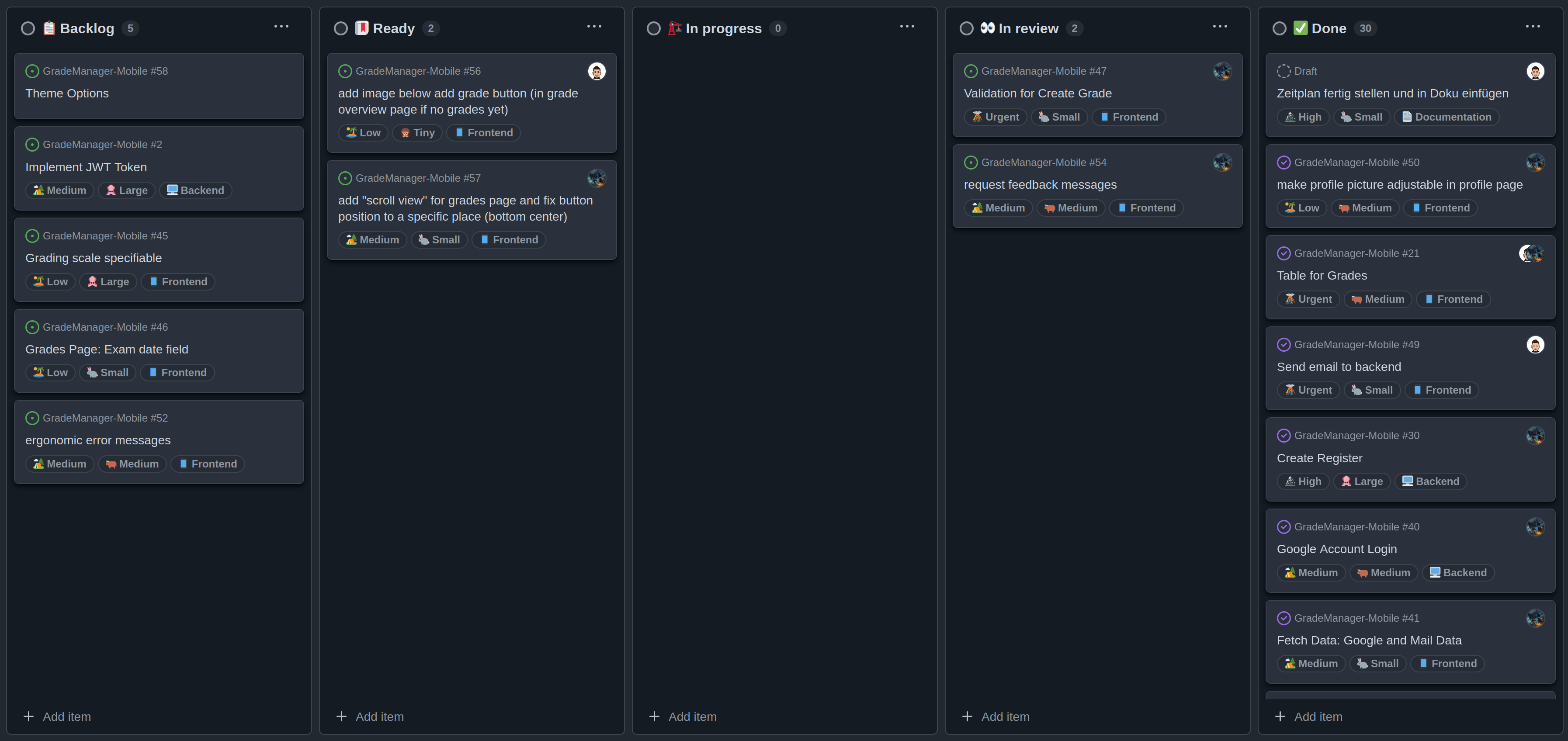 Initially, we created the most necessary tasks as issues in the Ready column and clarified who would start with which task. The biggest advantage for us developers is that everyone can work independently and assign themselves a task they're interested in. Once a task is completed, it's moved to "In review" so the other team member can review the implementation, providing opportunities for mutual learning.