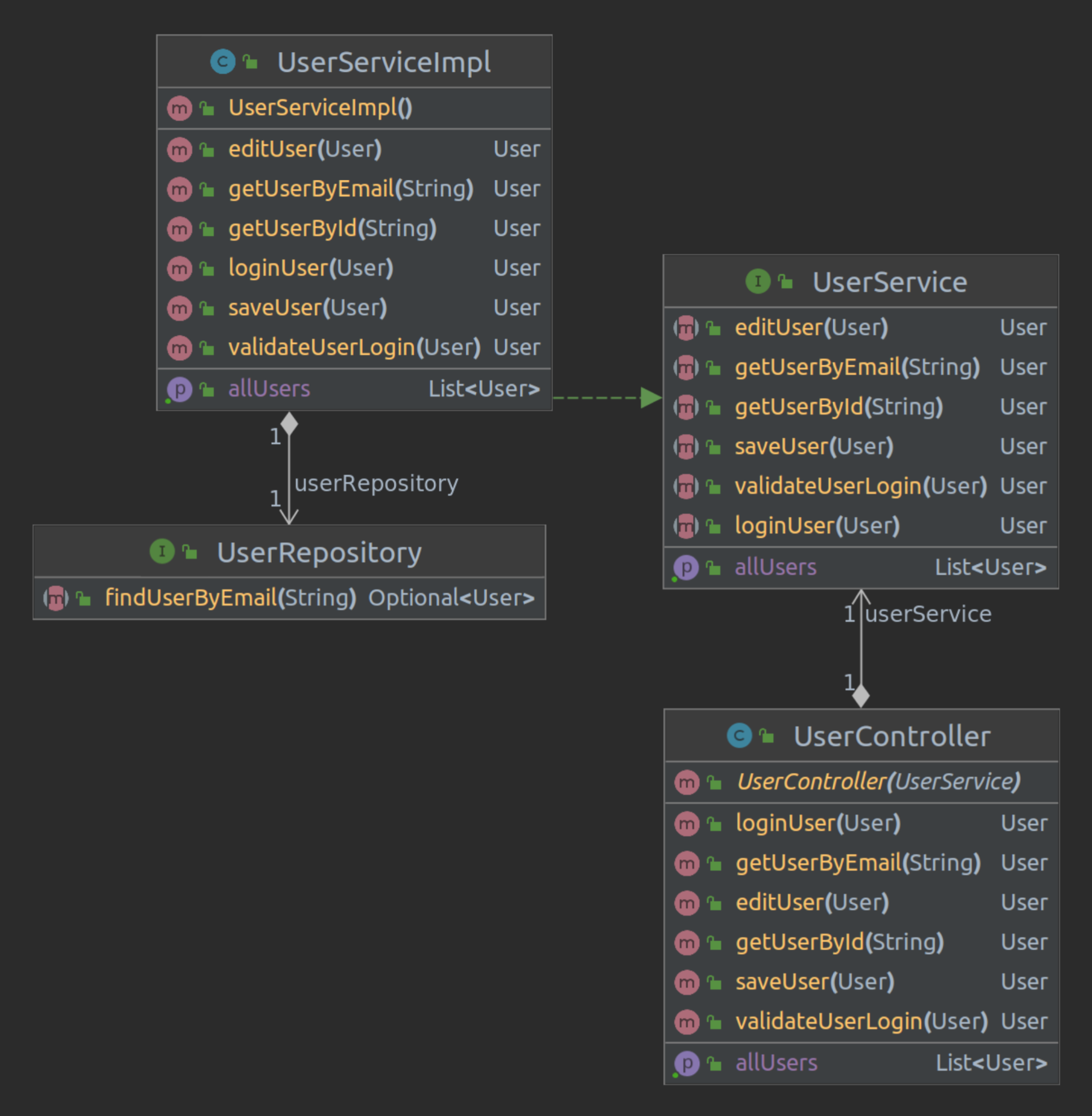 The UML diagrams show the typical structure of a Spring Boot application consisting of three main components: Repository, Controller, and Service. The Controller contains our API endpoints, the Repository enables JPA database access, and the Service implements the business logic executed when specific endpoints are called.