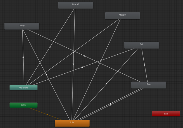 Complete animation flow showing idle, movement, jumping, attacking, and death states with conditional transitions.